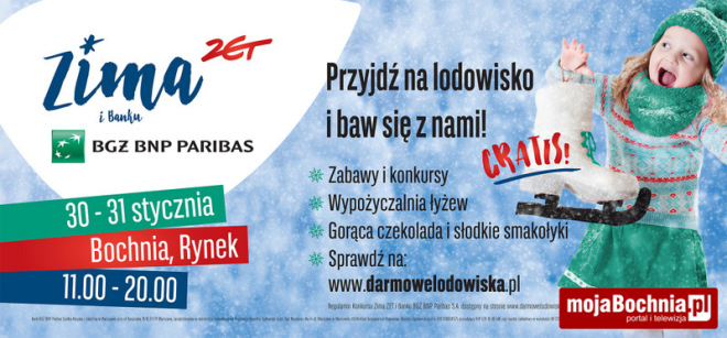 W najbliższy weekend na Rynku w Bochni będzie można gratis poślizgać się na mobilnym lodowisku. Powstanie ono z inicjatywy Banku BGŻ BNP Paribas i Radia Zet, organizujących podobne akcje w wybranych miastach w Polsce.