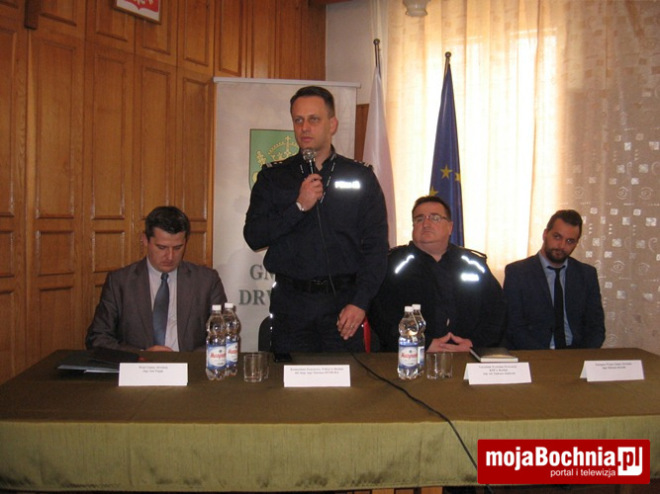 3 lutego w siedzibie Urzędu Gminy Drwinia na zaproszenie wójta Jana Pająka oraz Komendanta Powiatowego Policji w Bochni mł. insp. Mariusza Dymury odbyło się spotkanie, na którym samorządowcy, policja i przedstawiciele lokalnej społeczności dyskutowali na temat poziomu bezpieczeństwa w gminie. W trakcie dyskusji przyjęto szereg uwag i opracowano pewne koncepcje działania, mających na celu jeszcze skuteczniejszą pracę na rzecz poprawy bezpieczeństwa lokalnej społeczności.