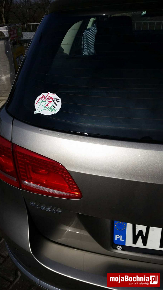 Jak informowaliśmy na łamach mojaBochnia.pl, Ryszard Piekarczyk zaprojektował kilka znaków graficznych, które można samodzielnie pobrać i wydrukować. Gotowe naklejki można również odbierać w drukarni Profil Graphic przy ul. Kazimierza Wielkiego 1 (w bramie naprzeciwko Urzędu Miasta Bochnia). Do dziś wydano już około stu naklejek. Dowody akcji trafiają na naszą redakcyjną skrzynkę w postaci zdjęć od czytelników, którzy już okleili swoje samochody (ciągle czekamy na kolejne fotki).