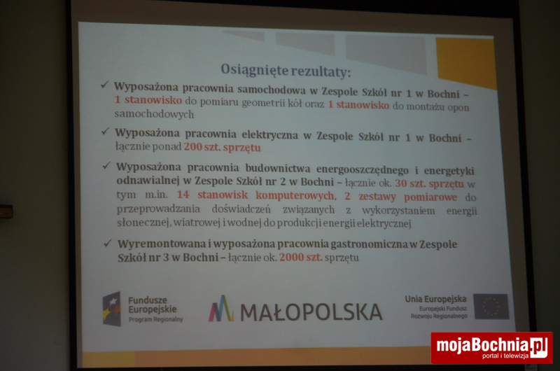 W efekcie w Zespole Szkół nr 1 w Bochni wyposażono pracownię samochodową w stanowisko do pomiaru geometrii kół oraz stanowisko do montażu opon samochodowych jak również wyposażono pracownię elektryczną . W Zespole Szkół nr 2 w Bochni wyposażono pracownię budownictwa energooszczędnego i energetyki odnawialnej, zakupiono m.in. komputery, zestawy pomiarowe do przeprowadzania doświadczeń związanych z wykorzystaniem energii słonecznej, wiatrowej i wodnej do produkcji energii elektrycznej. Natomiast z Zespole Szkół nr 3 w Bochni natomiast wyremontowano i wyposażono pracownię gastronomiczną.