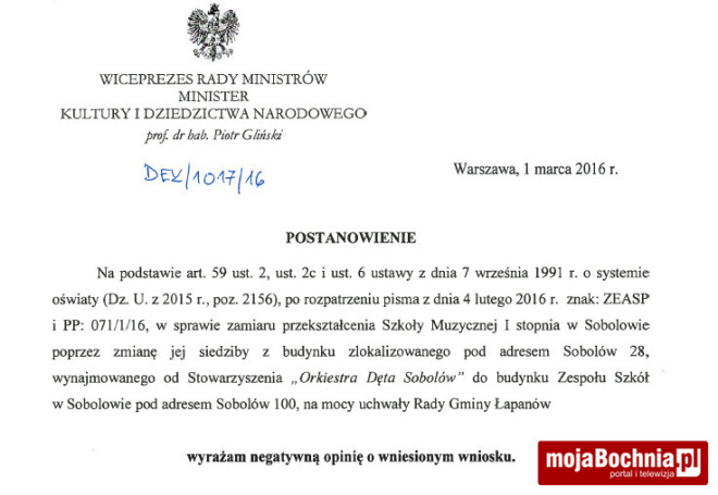 Piotr Gliński, Wicepremier oraz Minister Kultury i Dziedzictwa Narodowego nie zgadza się na zmianę siedziby Szkoły Muzycznej w Sobolowie. Wydał w tej sprawie postanowienie.