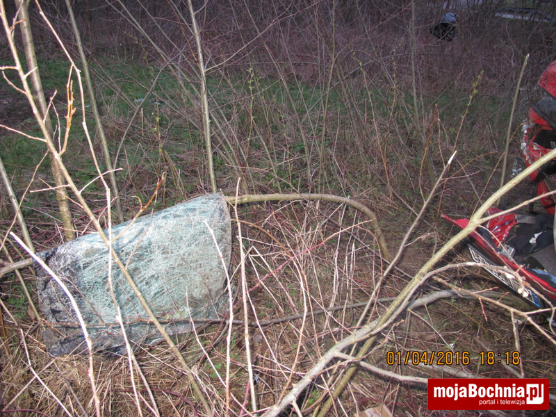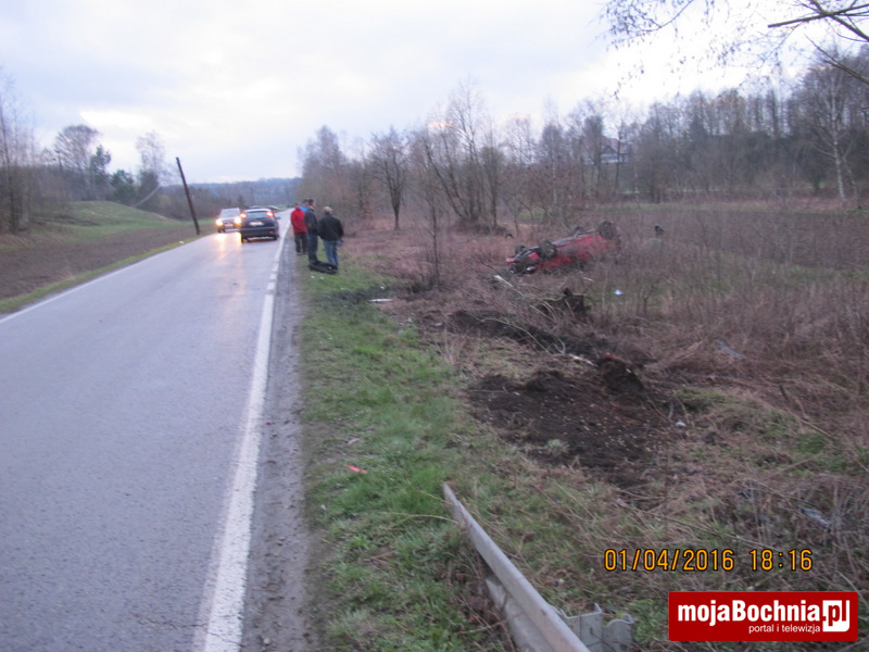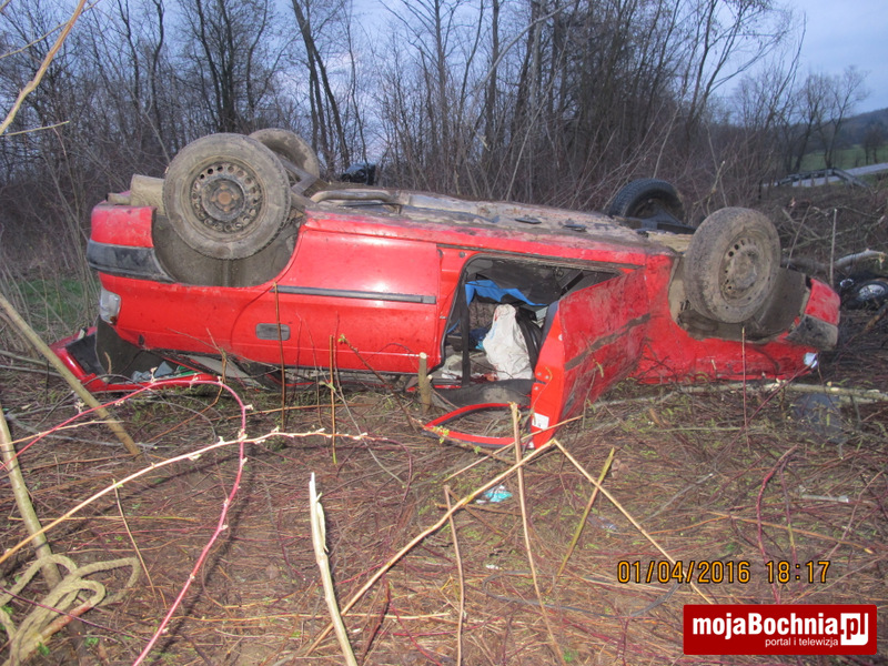 Kierujący samochodem Opel Astra pokonując lewoskrętny łuk drogi utracił panowanie nad pojazdem, zjechał z jezdni na pobocze, a następnie do przydrożnego rowu, gdzie doszło do wywrócenia się pojazdu na dach. Oplem podróżowało 5 osób. Kierowca nieprzytomny z poważnym urazem głowy został zabrany do szpitala w Krakowie przez Lotnicze Pogotowie Ratunkowe, trzech pasażerów z lekkimi obrażeniami trafiło do szpitala w Limanowej i Bochni, jeden z pasażerów nie doznał obrażeń i pozostał na miejscu zdarzenia.