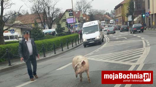 Dzisiaj około 13.00 w centrum Bochni biegała świnia. Zwierzę wydostało się z przyczepy, którą było przewożone, na ulicę; miało to miejsce w rejonie sygnalizacji świetlnej na skrzyżowaniu ulic Kościuszki i Floris. Zanim je schwytano, zdążyło wywołać niewielkie utrudnienia w ruchu.