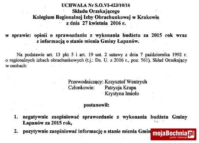 Gmina Łapanów dostała negatywną opinię Regionalnej Izby Obrachunkowej za wykonanie budżetu z 2015 r. Powodem są zobowiązania wymagalne powstałe w minionym roku oraz zapłacone odsetki.