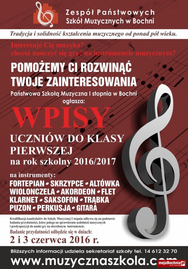 Zespół Państwowych Szkół Muzycznych w Bochni rozpoczyna zapisy do szkoły uzdolnionych muzycznie i chcących uczyć się gry na instrumentach muzycznych dzieci i młodzieży w wieku od 6 do 16 roku życia. Podania o przyjęcie do szkoły należy składać w sekretariacie Szkoły Muzycznej do środy 1 czerwca 2016 roku.