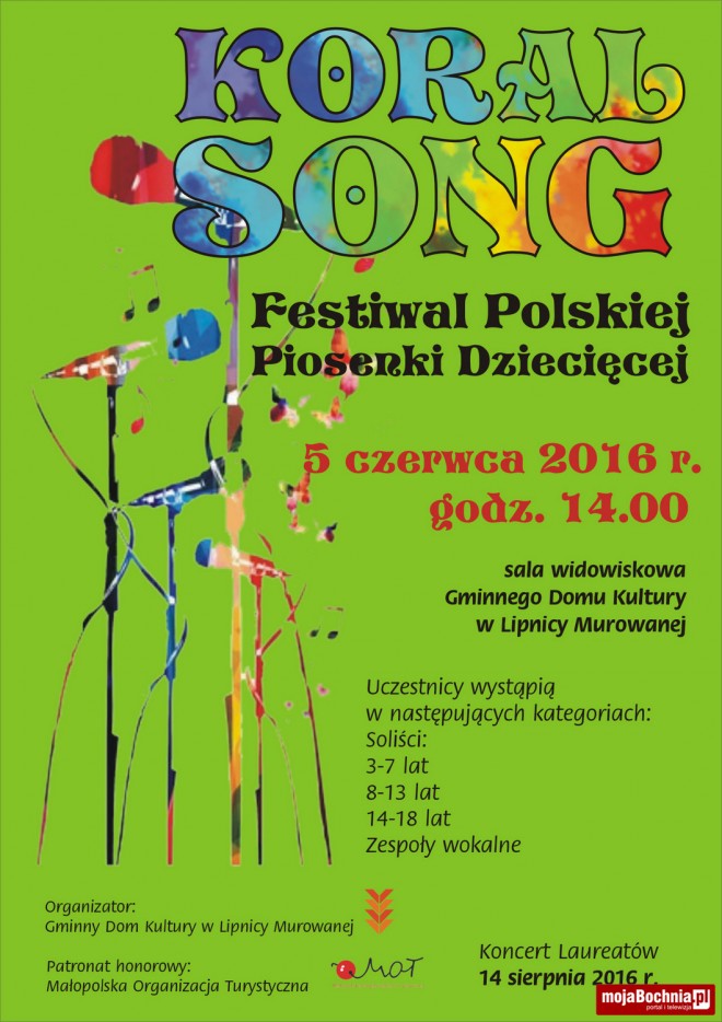 W najbliższą niedzielę – 5 czerwca w Lipnicy Murowanej odbędzie się I Festiwal Polskiej Piosenki Dziecięcej KORAL SONG. Przesłuchania konkursowe będą miały miejsce w siedzibie Gminnego Domu Kultury w Lipnicy Murowanej gdzie od godziny 14:00.
