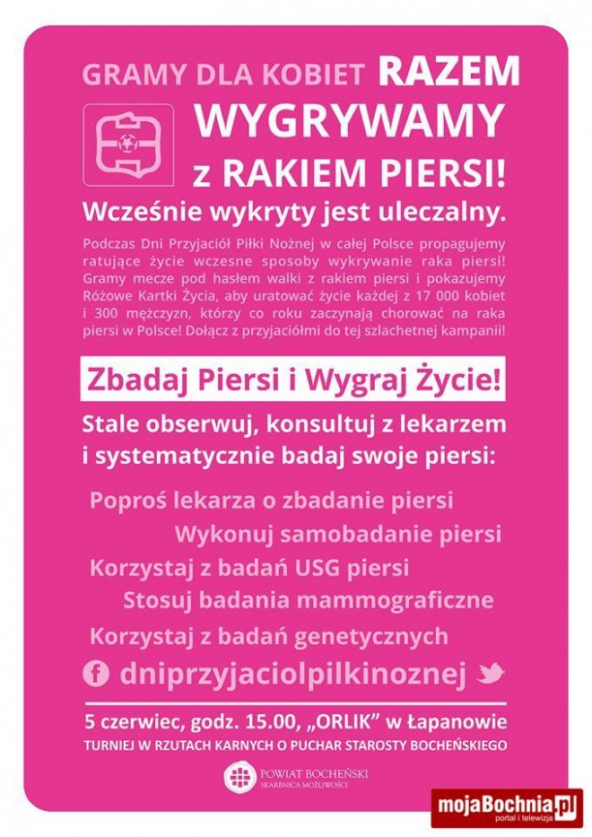 5 czerwca od godz. 15.00 podczas rozgrywanych turniejów będzie można dowiedzieć się o profilaktyce raka piersi.