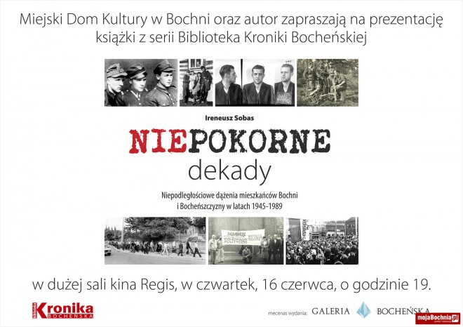 Miejski Dom Kultury oraz autor zapraszają na prezentację książki „Niepokorne dekady. Niepodległościowe dążenia mieszkańców Bochni i Bocheńszczyzny w latach 1945-1989”, która odbędzie się w czwartek 16 czerwca o godz. 19.00 w dużej sali kina Regis.