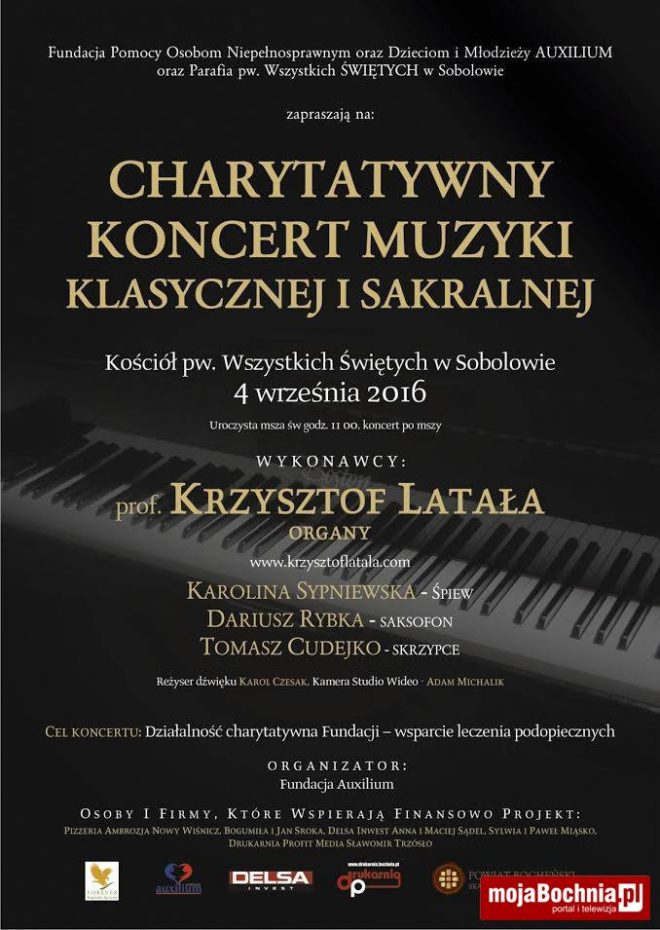 W niedzielę 4 września w kościele parafialnym w Sobolowie odbędzie się Charytatywny Koncert Muzyki Klasycznej i Sakralnej. Dochód zostanie przeznaczony na leczenie i rehabilitację Marcina Trybuły, który uległ wypadkowi na motocyklu.