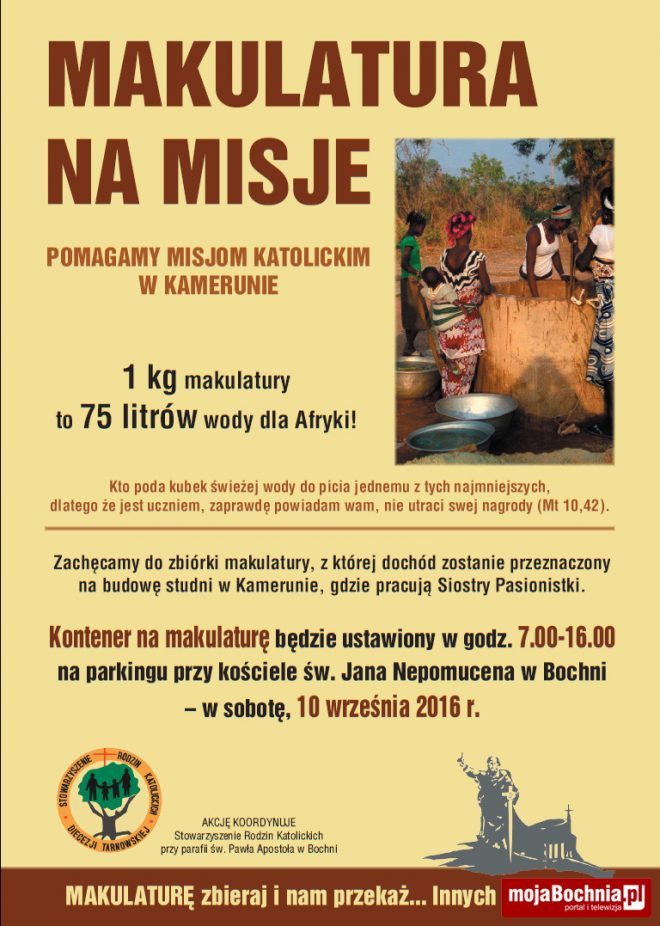 Po wakacyjnej przerwie w Bochni odbędzie się kolejna zbiórka makulatury. Dochód z niej zostanie przeznaczony na pomoc dla Afryki.