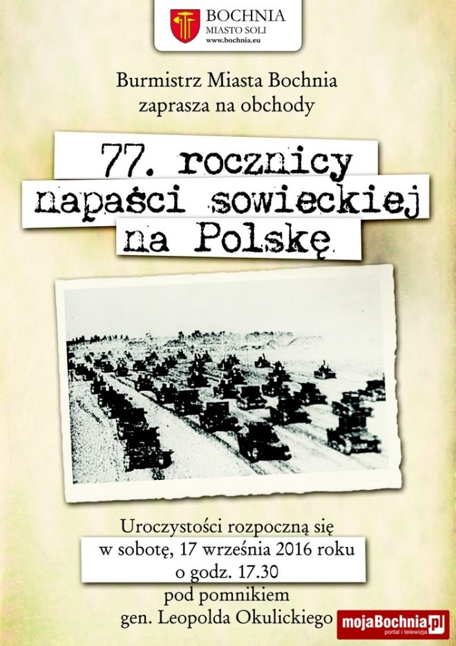 Burmistrz Bochni zaprasza mieszkańców miasta i okolic do uczczenia pamięci ofiar agresji sowieckiej na Polskę. Uroczystość upamiętniająca te wydarzenia odbędzie się w sobotę 17 września o godz. 17.30, pod pomnikiem gen. Leopolda Okulickiego, gdzie po krótkiej modlitwie i okolicznościowych przemówieniach nastąpi złożenie kwiatów w hołdzie poległym.
