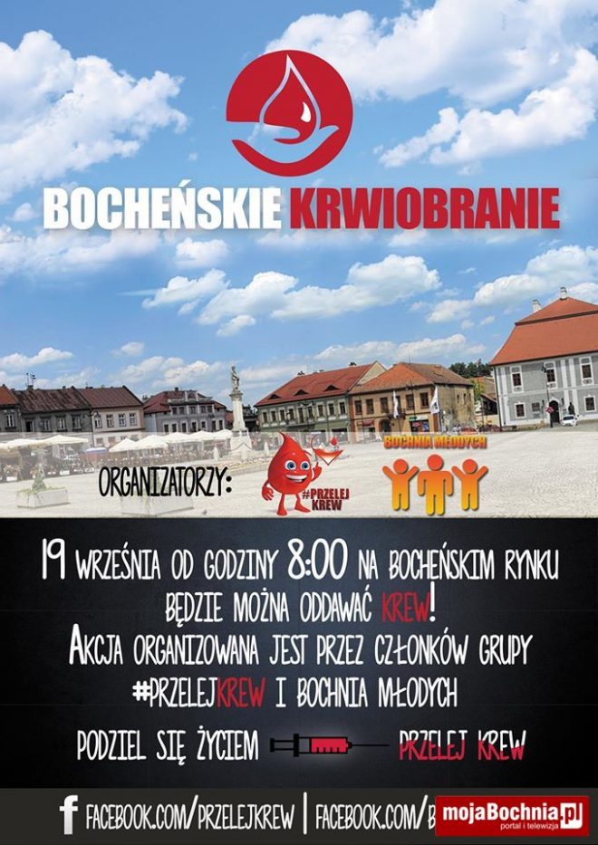Akcja „Bocheńskie krwi obranie” potrwa w godzinach od 8.00 do 13.00. Jej organizatorami są dwie grupy społecznościowe: Bochnia młodych oraz #przelejkrew.