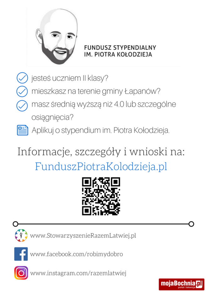 Uczniowie I Liceum Ogólnokształcącego w Bochni mieszkający na terenie gminy Łapanów ze średnią co najmniej 4,0 mają szansę na pomoc materialną z Funduszu stypendialnego im. Piotra Kołodzieja.