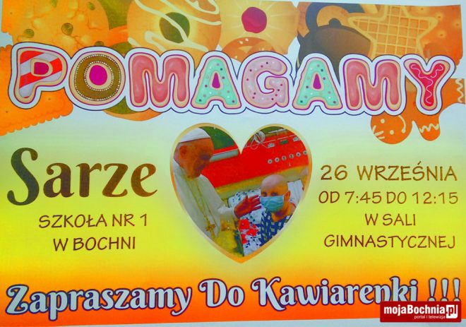 W poniedziałek w szkole podstawowej nr 1 w Bochni odbędzie się charytatywna kawiarenka na rzecz Sary Nizioł. Jeszcze w kwietniu brała w akcji charytatywnej na rzecz chorej mieszkanki Leksandrowej, niedługo później stwierdzono u niej guza mózgu wielkości 12 cm.