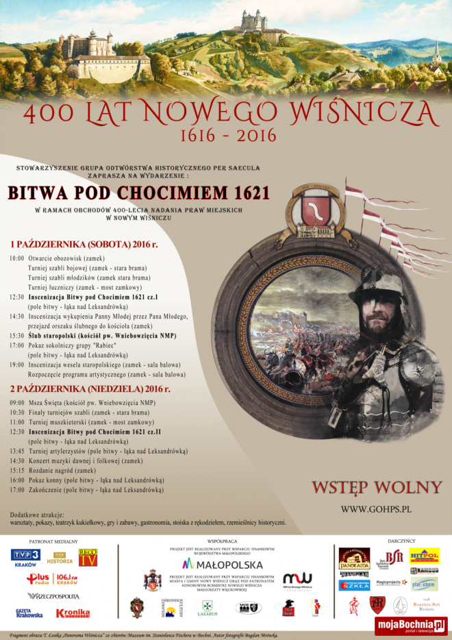 W najbliższy weekend w okolicach Zamku w Wiśniczu będzie można obejrzeć pokazy grup odtwórstwa historycznego. 1 i 2 października odbędą się tam rekonstrukcje “Bitwy pod Chocimiem 1621”. Jest to niezwykłe widowisko zarówno dla dorosłych jak i najmłodszych, a zarazem wspaniała lekcja historii, związanej z Wiśniczem za sprawą Stanisława Lubomirskiego.