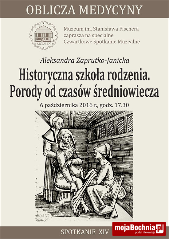 Muzeum im. Stanisława Fischera w Bochni zaprasza 6 października o godz. 17.30 na specjalne Czwartkowe Spotkanie Muzealne. Aleksandra Zaprutko-Janicka wygłosi referat pt. „Historyczna szkoła rodzenia. Porody od czasów średniowiecza”. Będzie to jednocześnie 14. spotkanie z cyklu „Oblicza Medycyny”.