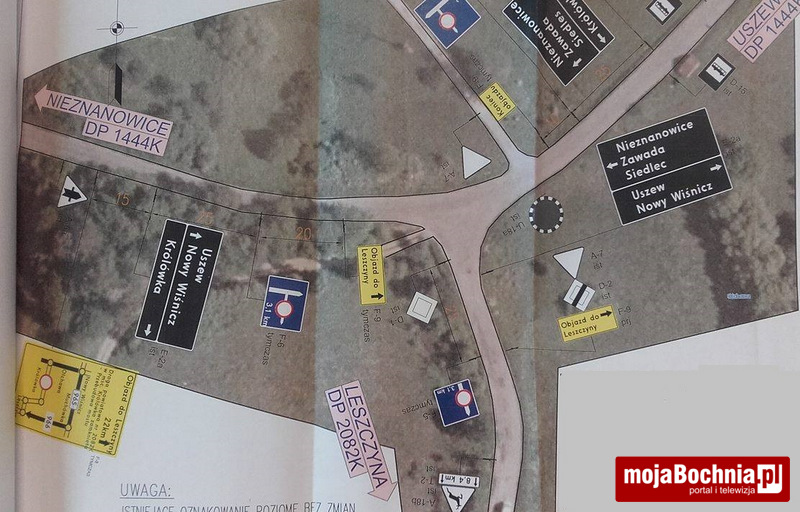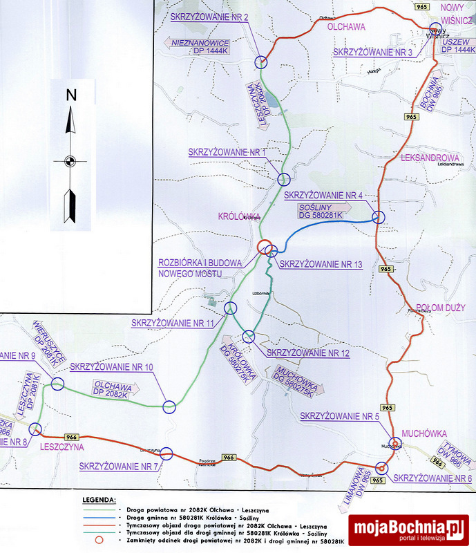 W związku z pracami wprowadzona została tymczasowa organizacja ruchu polegająca całkowitym zamknięciu drogi powiatowej w Królówce i wyznaczeniu objazdów drogą powiatową 1444K na odcinku Olchawa-Nowy Wiśnicz, a następnie drogą wojewódzką 965 na odcinku Nowy Wiśnicz-Muchówka i drogą wojewódzką 966 na odcinku Muchówka-Leszczyna. Z uwagi na zamknięcie drogi gminnej Królówka-Sośliny, objazd tymczasowy wyznaczono istniejącymi drogami gminnymi. Na czas prowadzonych robót utrzymany zostanie ruch pieszych poprzez wykonanie tymczasowej kładki dla pieszych.