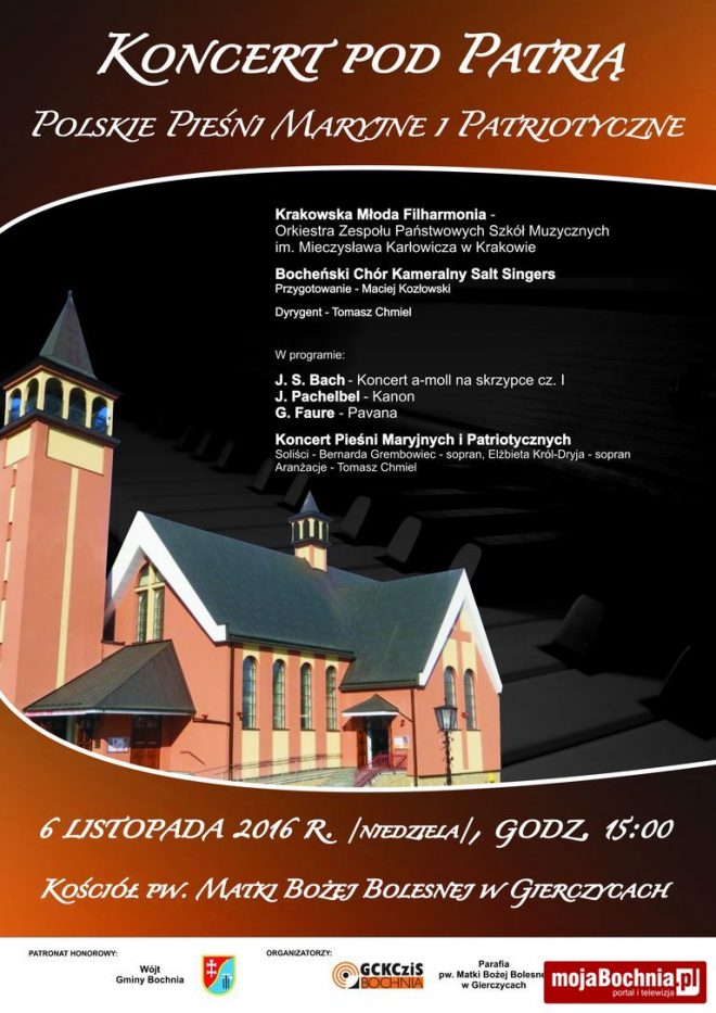 Gminne Centrum Kultury Czytelnictwa i Sportu w Bochni zaprasza na „Koncert pod Patrią. Polskie Pieśni Maryjne i Patriotyczne”, który odbędzie się 6 listopada (niedziela), o godz. 15:00 w kościele pw. Matki Bożej Bolesnej w Gierczycach.