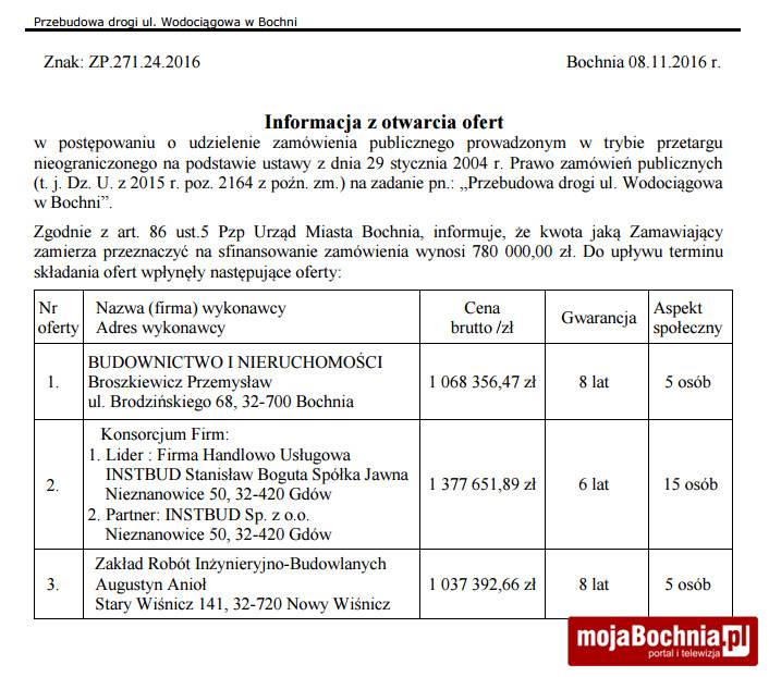 Będziemy poszerzać fragment ul. Wodociągowej od wiaduktu kolejowego w stronę ul. Karosek, będzie więc zupełnie inna jazda. Jesteśmy po przetargu, nie jest jeszcze wyłoniony wykonawca. Teraz musi być sprawdzona dokumentacja tych, którzy zgłosili się do przetargu. Czasami wymagane są uzupełnienia. Jeżeli pogoda pozwoli na realizację, będzie to zrobione jeszcze w tym roku – powiedział w rozmowie z mojaBochnia.pl burmistrz Stefan Kolawiński.