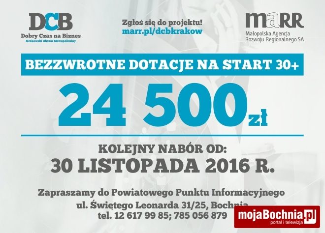 Małopolska Agencja Rozwoju Regionalnego S.A. jako realizator projektu „Dobry Czas na Biznes Krakowski Obszar Metropolitalny” współfinansowanego z Europejskiego Funduszu Społecznego w ramach działania 8.3.1. Regionalnego Programu Operacyjnego Województwa Małopolskiego na lata 2014 – 2020 zaprasza do wzięcia udziału w ww. projekcie osoby zamieszkujące powiat bocheński chcące założyć własną działalność gospodarczą.