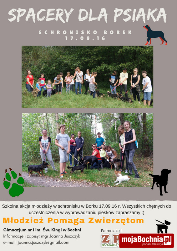 Młodzież z bocheńskiego Gimnazjum nr 1 dwa razy w miesiącu (niezależnie od pogody) wyprowadza na spacery psy ze schroniska w Borku. Organizują również zbiórki, aby zdobyć pieniądze na karmę. Ich pomoc może być jeszcze szersza, jeśli wygrają grant w konkursie internetowym. Dlatego warto im pomóc.