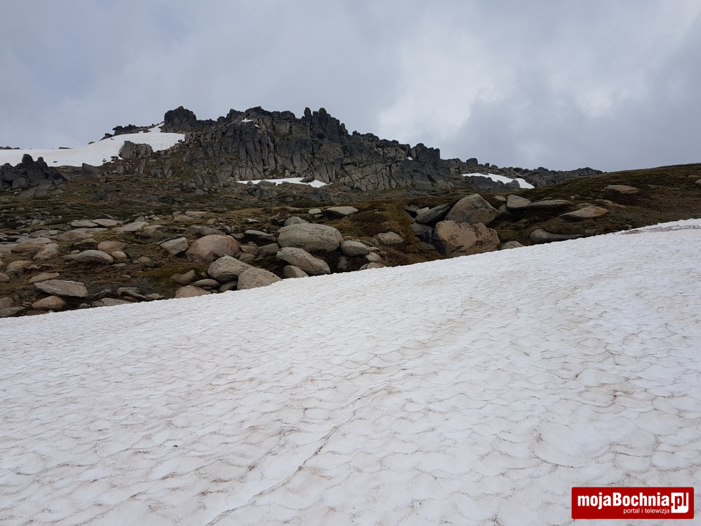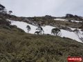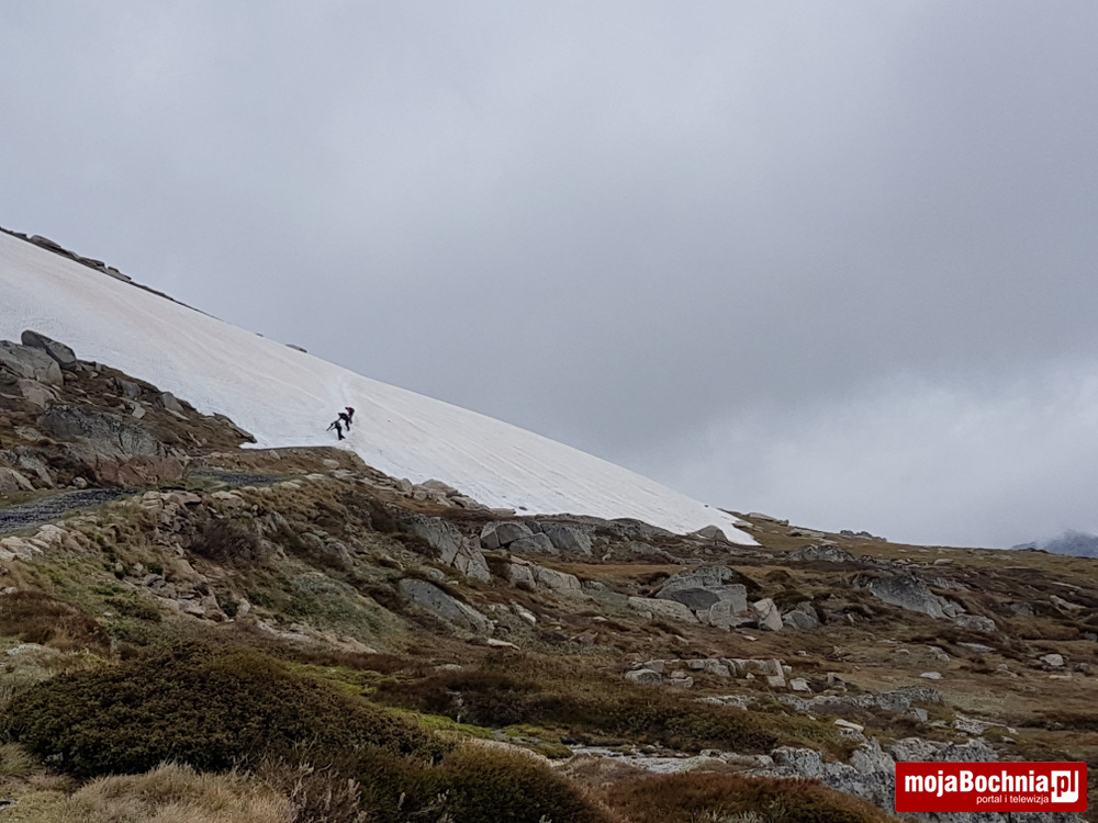 Dobiegam do pierwszych płatów śnieżnych, które trzeba trawersować. Ostatni płat śnieżny jest dość stromy – przydałyby mi się raki;)