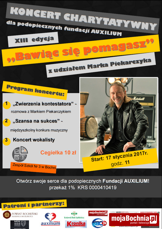 17 stycznia o godz. 11.00 w Zespole Szkół Nr 3 w Bochni odbędzie się XIII edycja Imprezy Charytatywnej „Bawiąc się pomagasz”. Celem tegorocznej edycji jest zebranie funduszy dla chorych dzieci, podopiecznych bocheńskiej Fundacji „AUXILIUM”.