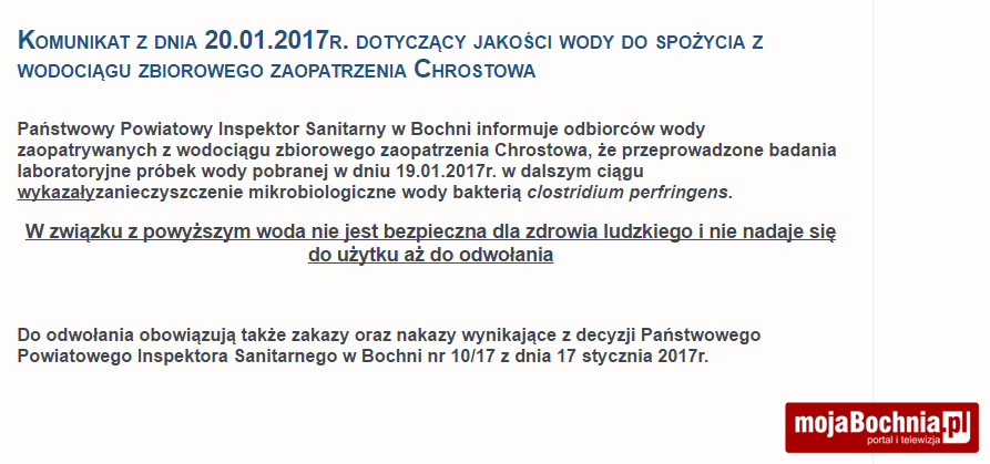 Państwowy Powiatowy Inspektor Sanitarny w Bochni informuje odbiorców wody zaopatrywanych z wodociągu zbiorowego zaopatrzenia Chrostowa, że przeprowadzone badania laboratoryjne próbek wody pobranej w dniu 19.01.2017r. w dalszym ciągu wykazały zanieczyszczenie mikrobiologiczne wody bakterią clostridium perfringens.
