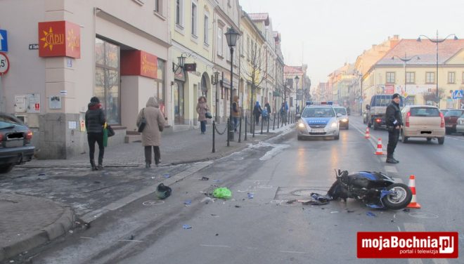 Kierująca (38 lat) samochodem osobowym marki Volvo, wykonując manewr skrętu w lewo z ulicy Kościuszki nie udzieliła pierwszeństwa przejazdu kierującemu motorowerem, który poruszał się w przeciwnym kierunku czym doprowadziła do zderzenia się pojazdów. Na skutek zdarzenia kierujący motorowerem (lat 34) został odwieziony do szpitala w Bochni z obrażeniami głowy. Kierujący trzeźwi – relacjonuje Łukasz Ostręga, oficer prasowy bocheńskiej policji.