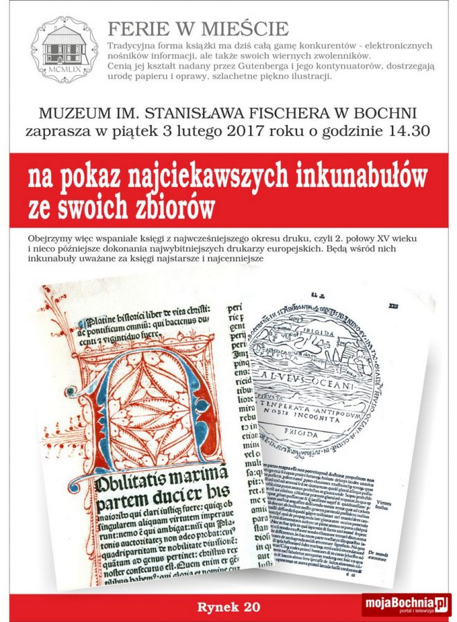 W związku z feriami Muzeum im. Stanisława Fischera serdecznie zaprasza w piątek na pokaz eksponatów wyjątkowych i rzadko prezentowanych – najciekawszych inkunabułów ze zbiorów Muzeum, czyli książek pochodzących z czasów narodzin druku i wynalazku Jana Gutenberga.