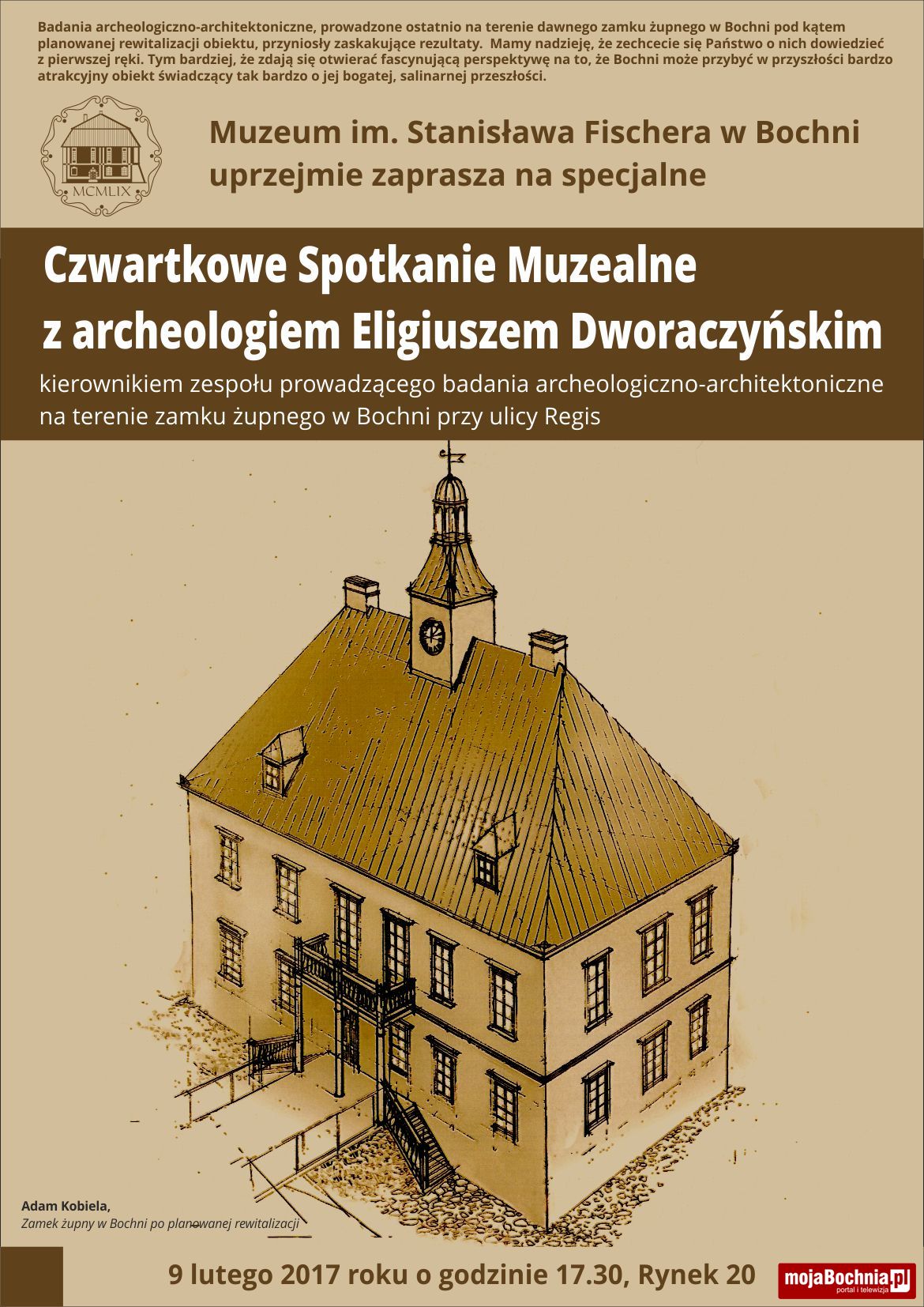 Muzeum im. Stanisława Fischera w Bochni zaprasza na specjalne Czwartkowe Spotkanie Muzealne z archeologiem Eligiuszem Dworaczyńskim, kierownikiem zespołu prowadzącego badania archeologiczno-architektoniczne na terenie zamku żupnego w Bochni przy ulicy Regis.