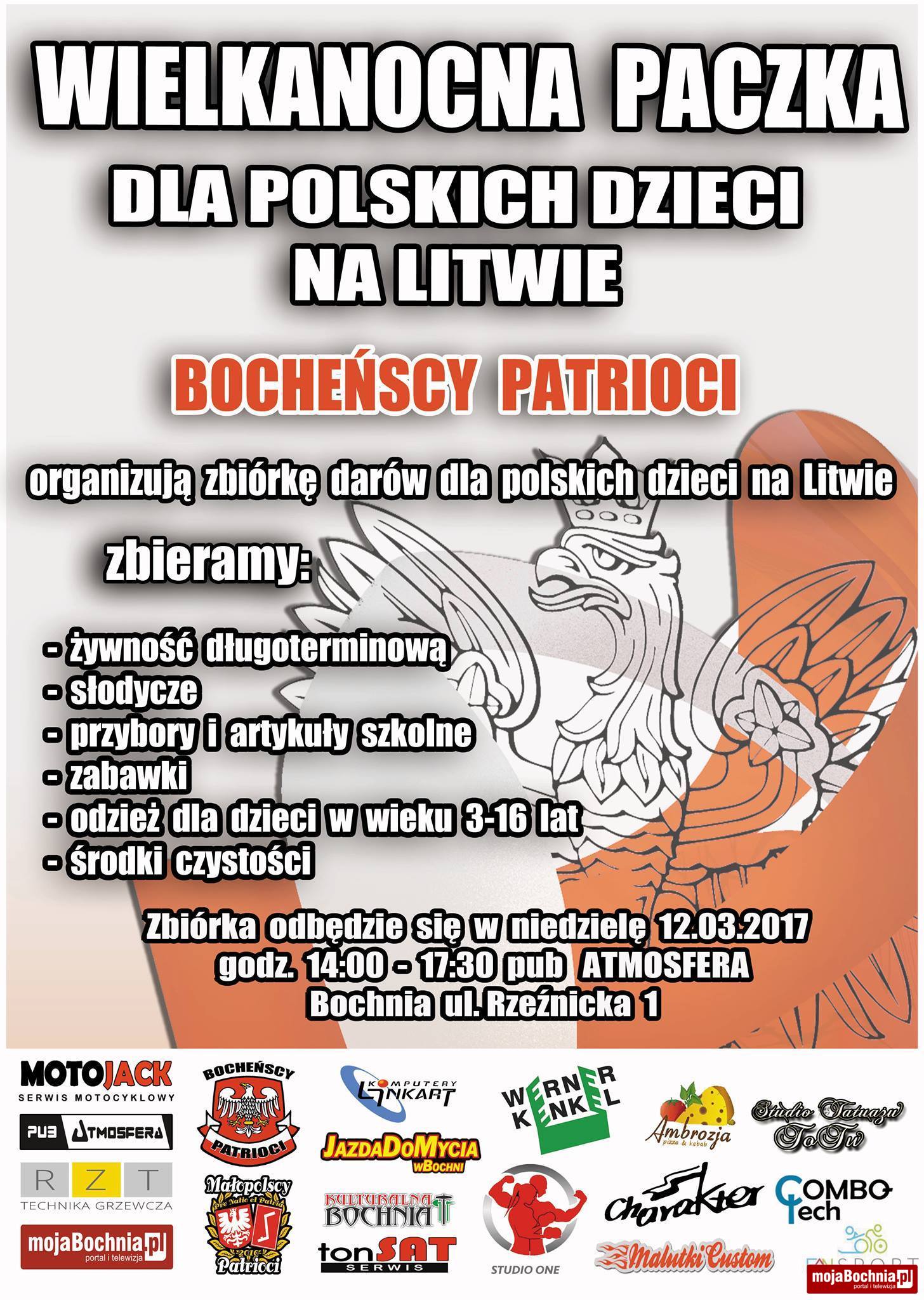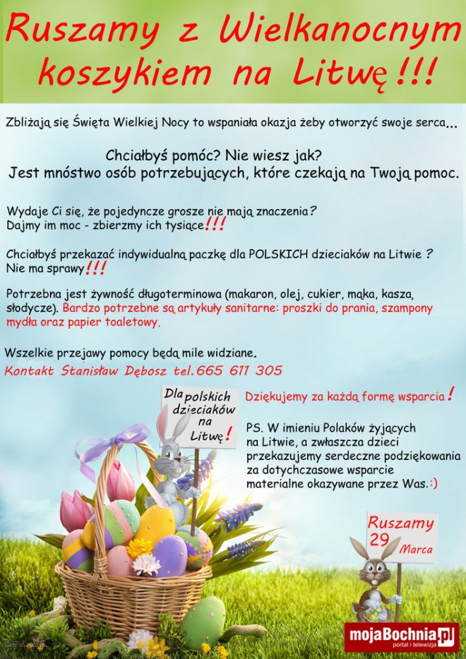 W Bochni trwa kolejna edycja „Pomocy dla polskich dzieci na Litwie”. 29 marca wyjedzie kolejny transport żywności, ubrań, zabawek oraz przyborów szkolnych. Trafią one w formie paczek wielkanocnych do dzieci z polskiego domu dziecka, polskich szkół i polskich rodzin.