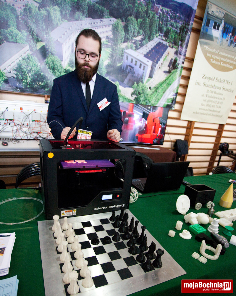 Mamy drukarkę 3D, za pomocą której można wykonać szachy i wiele innych elementów – mówi Jakub Sitko. W ubiegłym roku wystartowaliśmy z projektem drona, udało nam się zająć pierwsze miejsce. Dron badał zanieczyszczenia powietrza, staramy się udoskonalać ten projekt, piąć się coraz wyżej, może w przyszłości go sprzedać – mówi Paweł Zięć. Na targach prezentujemy robota, który został zakupiony na potrzeby szkoły w celu zainteresowania uczniów mechatroniką, robotyką, zachęcenia do programowania – mówi Mariusz Oleksy.