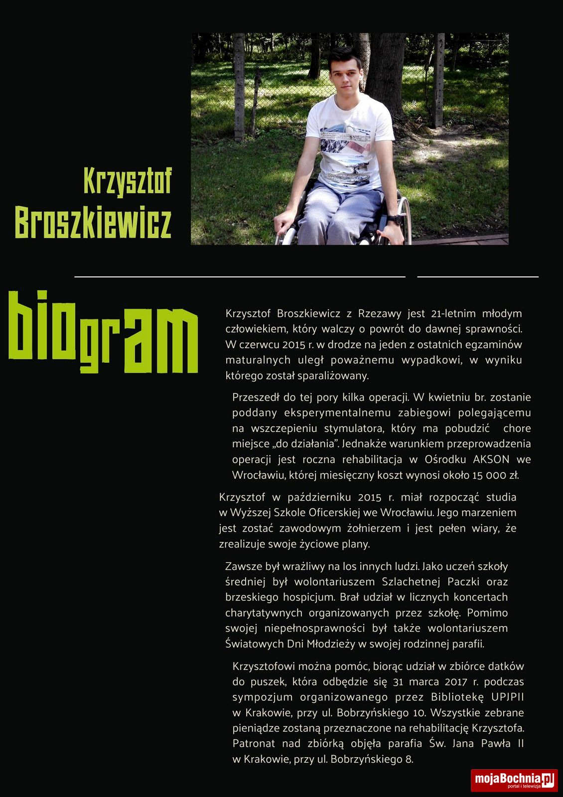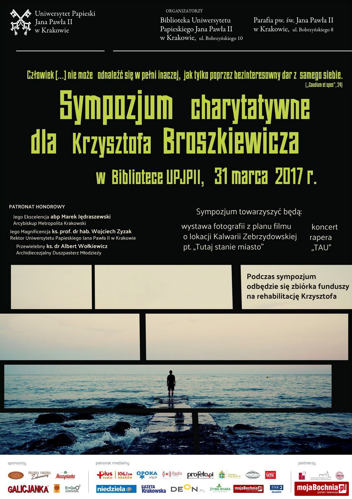 W Liście Apostolskim „Salvifici doloris” Święty Jan Paweł II odwołuje się do przypowieści o Miłosiernym Samarytaninie, którym jest każdy „kto świadczy pomoc w cierpieniu, jakiejkolwiek byłoby ono natury…Daje siebie, swoje własne „ja”, otwierając to „ja” dla drugiego…”. Ojciec Święty wskazuje na gotowość do podejmowania różnorodnych, konkretnych inicjatyw i działań, wypływających z głębi serc, które przyniosą pomoc poranionemu człowiekowi. To przez nie realizowane jest prawdziwie chrześcijańskie miłosierdzie. Wciąż żywe i aktualne przesłanie Papieża Polaka oraz rok 2017 ogłoszony Rokiem Świętego Brata Alberta, który stanowi kontynuację minionego Roku Miłosierdzia skłoniły Pracowników Biblioteki Uniwersytetu Papieskiego Jana Pawła II w Krakowie do podjęcia organizacji kolejnej konferencji, połączonej z akcją charytatywną na rzecz 20-letniego Krzysztofa Broszkiewicza z Rzezawy, sparaliżowanego w wyniku wypadku drogowego. Jego wiara w odzyskanie sprawności sprawia, że swoje plany na przyszłość odkłada w czasie. W październiku 2015 roku miał rozpocząć naukę w Wyższej Szkole Oficerskiej we Wrocławiu. Krzysztof wymaga długiej i bardzo kosztownej rehabilitacji. Dlatego też organizatorzy zbiórką pieniędzy do puszek w dniu sympozjum, nad którą Patronat objęła Parafia Św. Jana Pawła II, przy ul. Bobrzyńskiego 8 w Krakowie, chcą wspomóc Krzysztofa w powrocie do dawnej sprawności – czytamy w materiałach prasowych organizatorów.