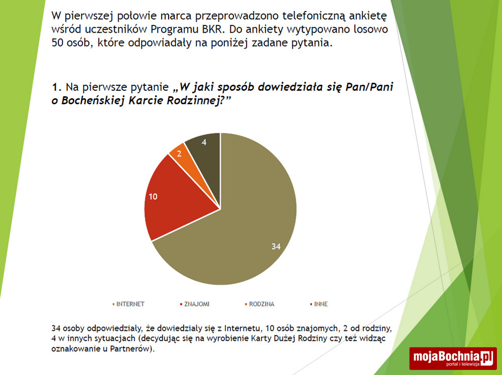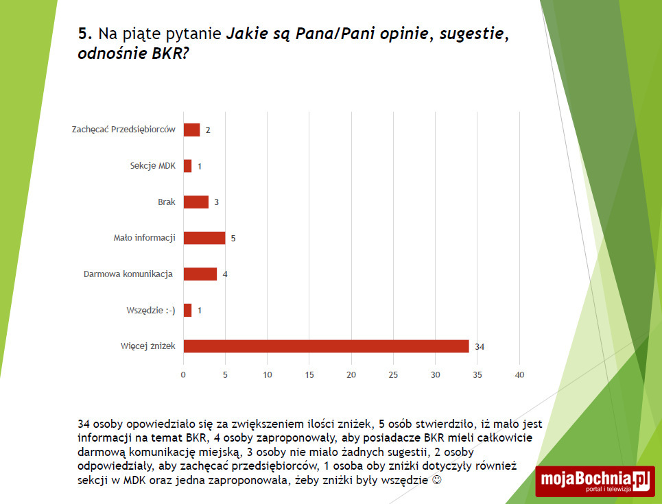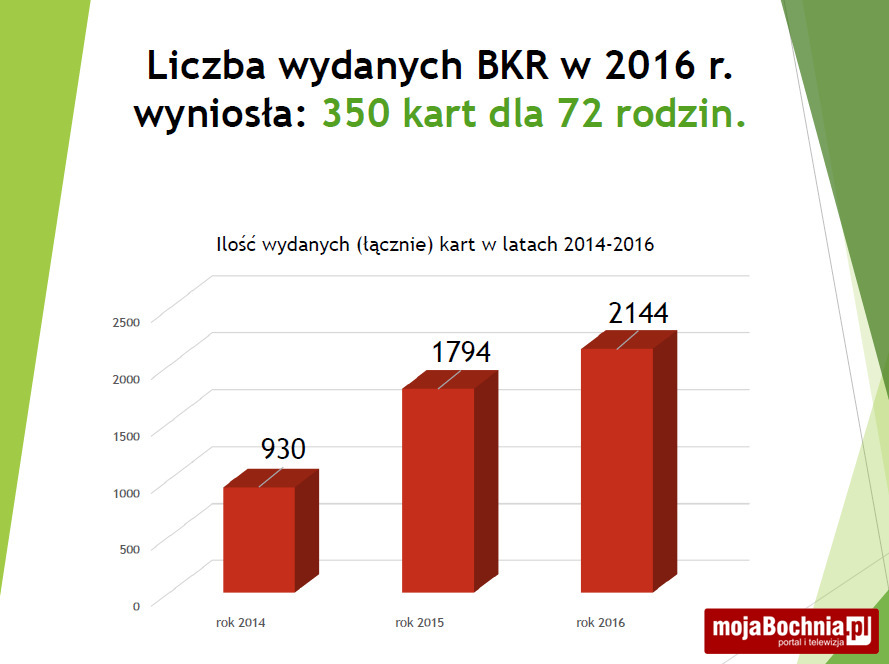 Marek Gruca, szef wspomnianej komisji, postawił też kilka wniosków na przyszłość. Jeden znich dotyczył szerszej promocji BKR. Nadszedł czas, aby podjąć zdecydowane działania marketingowe, wprost dostosowane do oczekiwań użytkowników oraz partnerów BKR. Oczekiwania rodzin wielodzietnych niezmiennie dotyczą ulg w opłatach, np. za wywóz odpadów komunalnych, czy za korzystanie z komunikacji zbiorowej – mówił. Jego zdaniem, program można byłoby promować na Dniach Bochni oraz w czasie Rodzinnej Niedzieli z NGO w Parku Uzbornia, a także poprzez media społecznościowe. Dzisiaj najlepiej przemawia się obrazami, zatem zachęcam do tworzenia i rozpowszechniania spotów wideo, we współpracy z partnerami i beneficjentami. Do tego celu warto wykorzystać łamy Kroniki Bocheńskiej… Czy nie warto na stronach tego miesięcznika atrakcyjnie wyróżnić partnerów przy okazji promując sam program?! Mamy do dyspozycji tablice informacyjnie na terenie całego miasta… – mówił Marek Gruca.