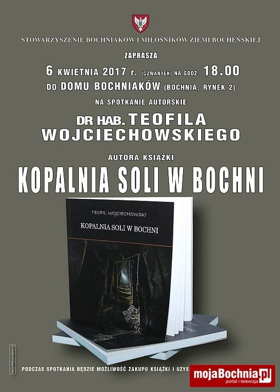 Stowarzyszenie Bochniaków i Miłośników Ziemi Bocheńskiej zaprasza na spotkanie autorskie z dr hab. Teofilem Wojciechowskim do Domu Bochniaków w czwartek 6 kwietnia 2017 r. na godz. 18.00. Podczas spotkania będzie możliwość nabycia książki i uzyskania autografu autora.