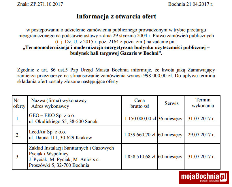 W Biuletynie Informacji Publicznej widnieją oferty złożone w przetargu. Nieznacznie przekraczają one przygotowaną przez magistrat kwotę. Czy to oznacza unieważnienie postępowania? Andrzej Koprowski zaznacza, że decyzja o tym, czy zostanie ogłoszony nowy przetarg, czy też będą przesunięte dodatkowe pieniądze powinna zapaść „w najbliższych dniach po szczegółowym przeanalizowaniu ofert”.