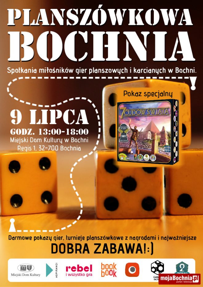 „Planszówkowa Bochnia” i Miejski Dom Kultury zapraszają w niedzielę 9 lipca o godz. 13. do sali lustrzanej na kolejne spotkanie z grami planszowymi. Jak zwykle będzie duża różnorodność gier, świetna atmosfera i dobra zabawa.