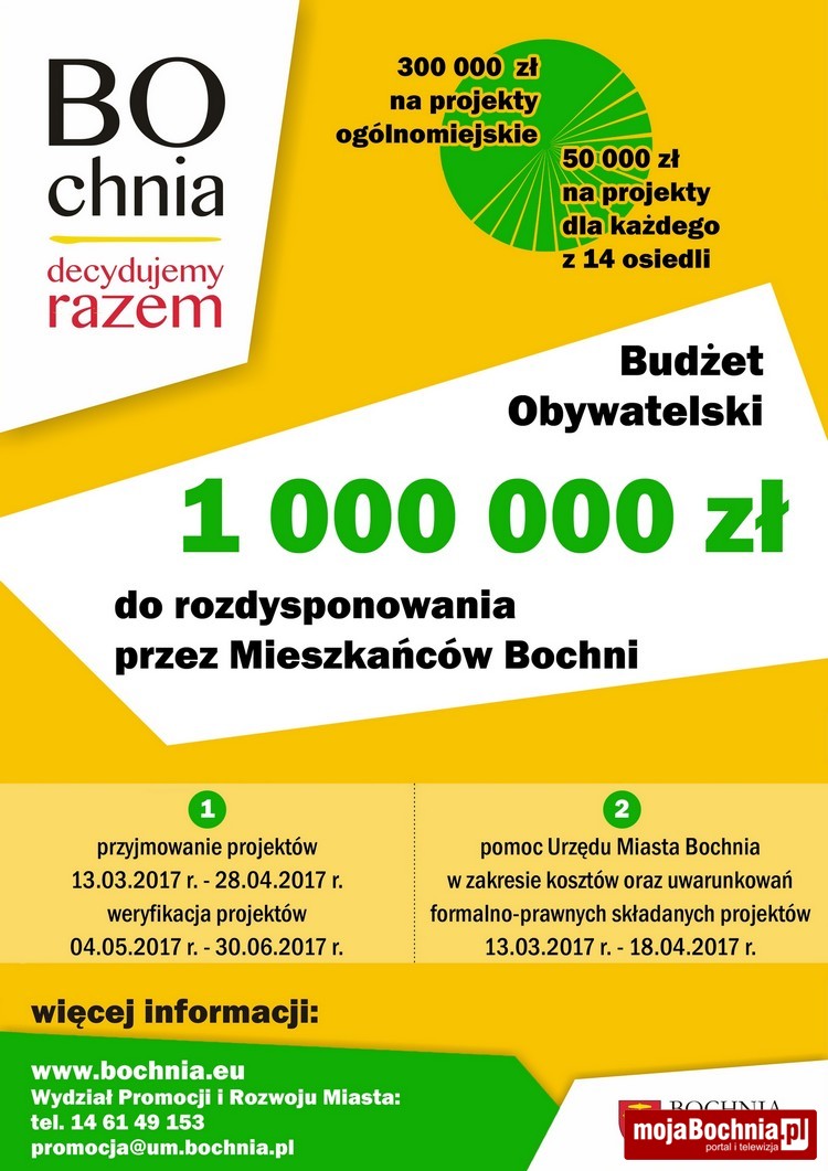 47 projektów złożyli mieszkańcy Bochni celem ich realizacji w ramach Budżetu Obywatelskiego Bochni na 2018 r., w tym 22 projekty ogólnomiejskie i 25 osiedlowych.