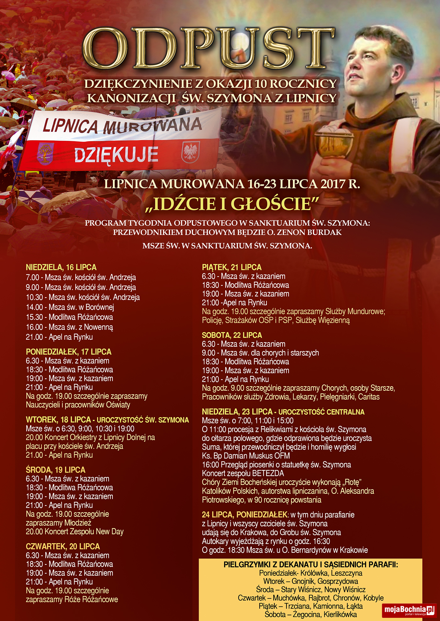 We wtorek 18 lipca, w uroczystość ku czci św. Szymona, Msze św. w Lipnicy Murowanej zostaną odprawione o godz. 6.30, 9.00, 10.30 i 19.00. O 20.00 na placu przy kościele św. Andrzeja odbędzie się koncert orkiestry z Lipnicy Dolnej, a o 21.00 na lipnickim Rynku – tradycyjny apel ku czci św. Szymona.