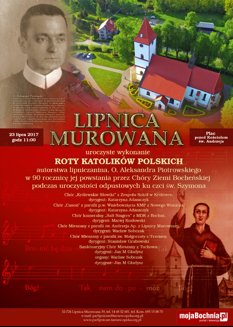 W ostatni dzień tygodniowego odpustu z kolei w Lipnicy będzie miało miejsce wyjątkowe wykonanie Roty katolików Polskich, w 90. rocznicę jej napisania przez lipniczanina, o. Aleksandra Piotrowskiego. Utwór, stanowiący parafrazę tekstu Marii Konopnickiej, wykonają w niedzielę 23 lipca na sumie o godz. 11.00 Chóry Ziemi Bocheńskiej.