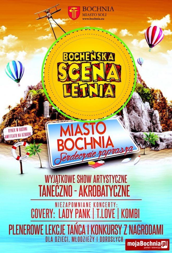Już w najbliższą niedzielę, 23 lipca, startuje VI edycja Bocheńskiej Sceny Letniej. Jak zwykle będzie różnorodnie. Na scenie oprócz niezapomnianych koncertów, podczas których będzie można usłyszeć m. in. covery: Lady Pank, T.Love czy Kombi, będzie można obejrzeć wyjątkowe występy artystyczne oraz wziąć udział w plenerowych lekcjach tańca i konkursach z nagrodami.
