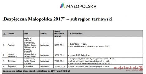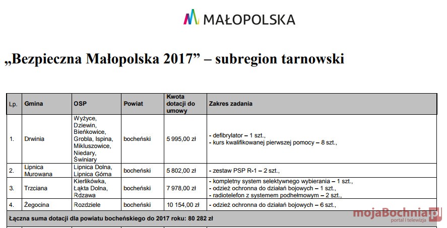 Oprócz tego samorząd województwa przekazał 14 jednostkom ochotniczej straży pożarnej z powiatu bocheńskiego sprzęt o wartości w sumie 31 tys. zł. są to m.in. defibrylator, odzież ochronna, radiotelefony, a także kursy pierwszej pomocy.