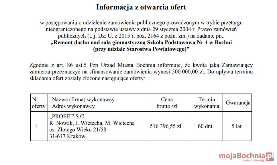 Ponad 516 tys. zł zaproponowała firma, która zgłosiła się do przetargu na remont dachu nad salą gimnastyczną Publicznej Szkoły Podstawowej nr 4 i II Liceum Ogólnokształcącego w Bochni. Tymczasem kwota przygotowana przez inwestora to 500 tys. zł.