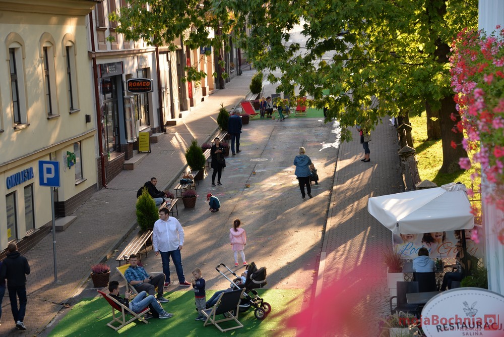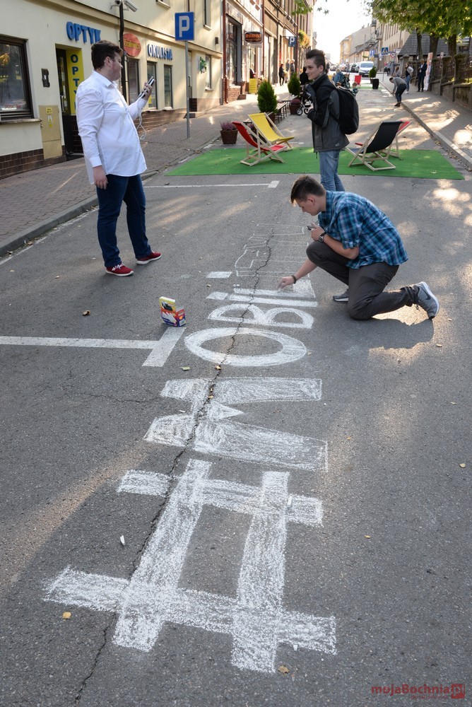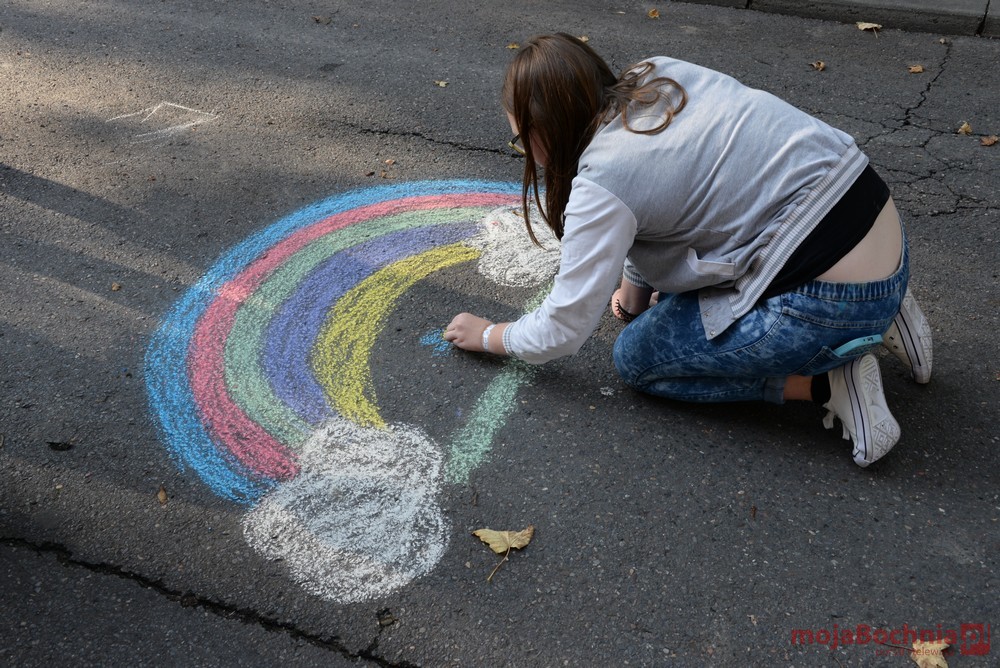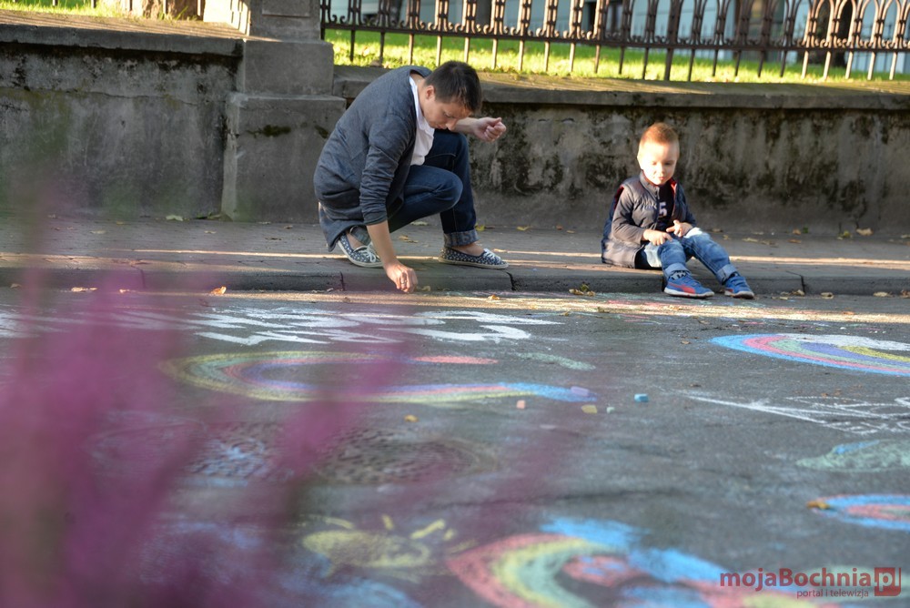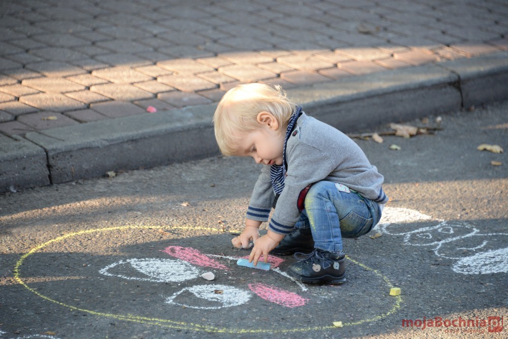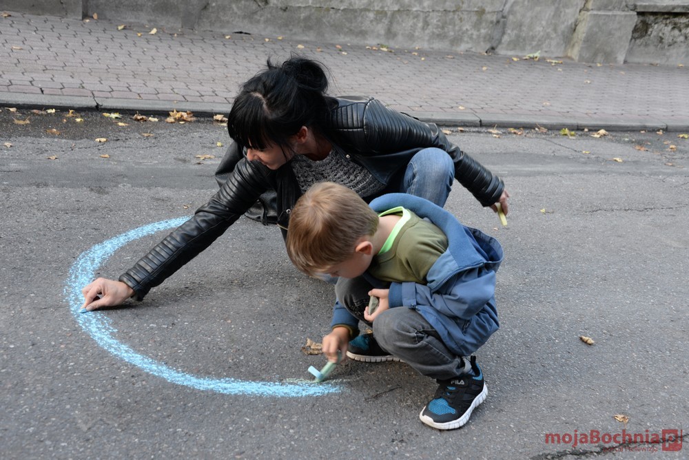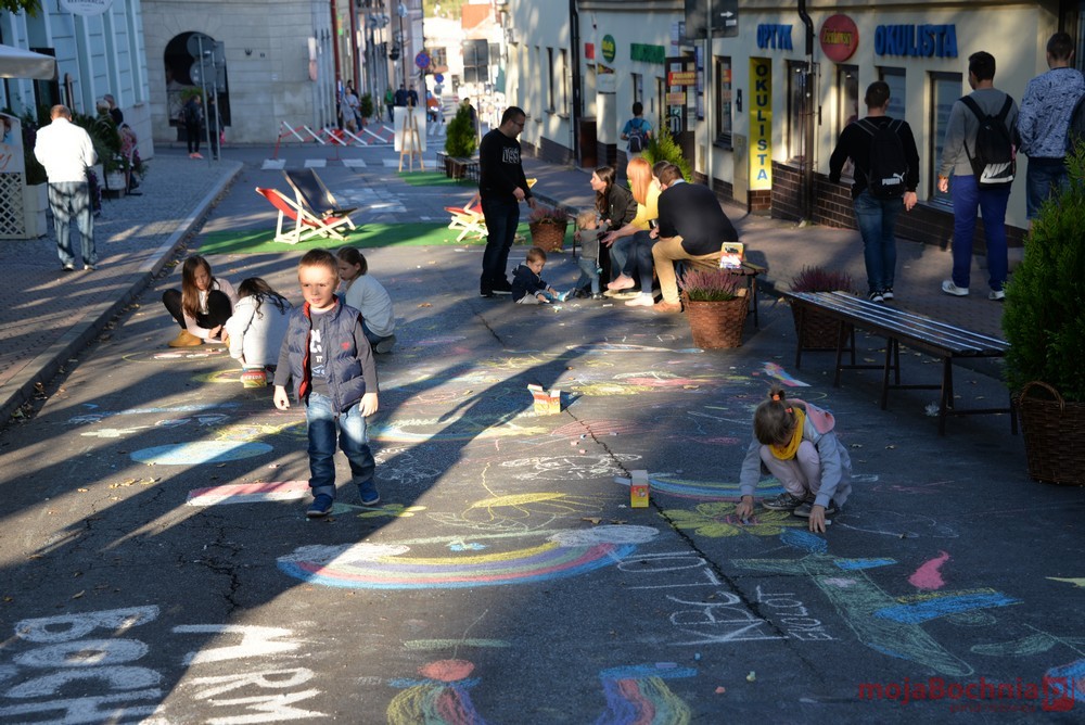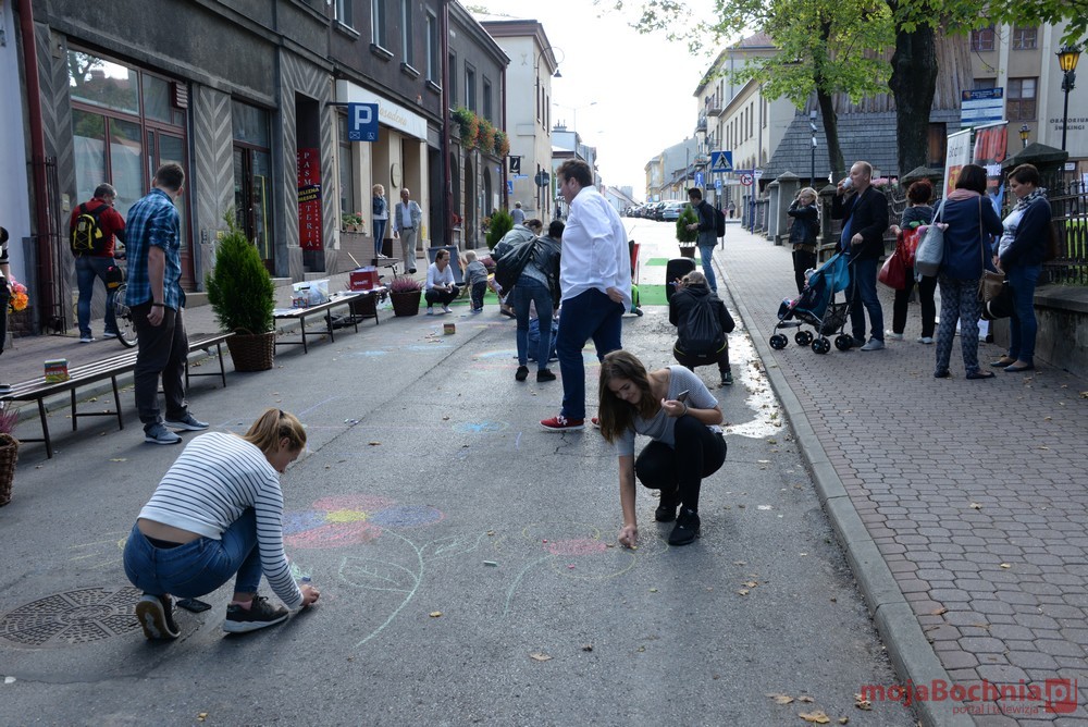„Uliczne obrazy kredą malowane” – taki był tytuł zajęć, w trakcie których dzieci i dorośli mogli na zamkniętym dla ruchu kołowego Placu tworzyć swoje uliczne dzieła. Dla tych, którzy uważali że nie mają talentu plastycznego istniała możliwość odpoczynku na leżakach. W zabawie wzięło udział kilkadziesiąt osób, pozostawiając na drodze kolorowe obrazy przedstawiające m.in. ekologiczne środki transportu, wariacje na temat herbu Bochni, a także roślinność.