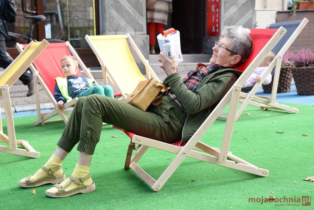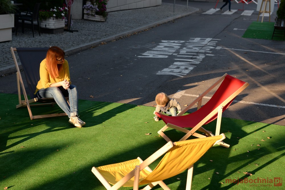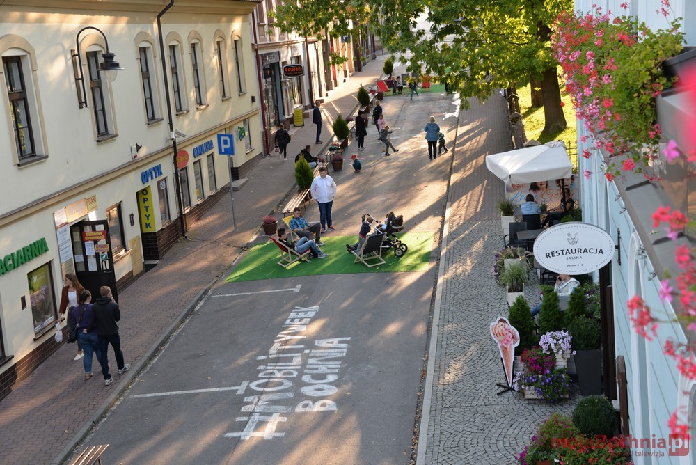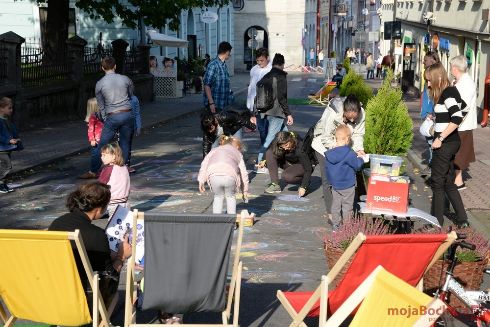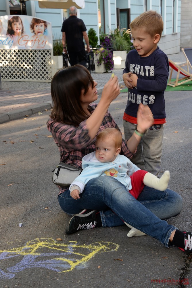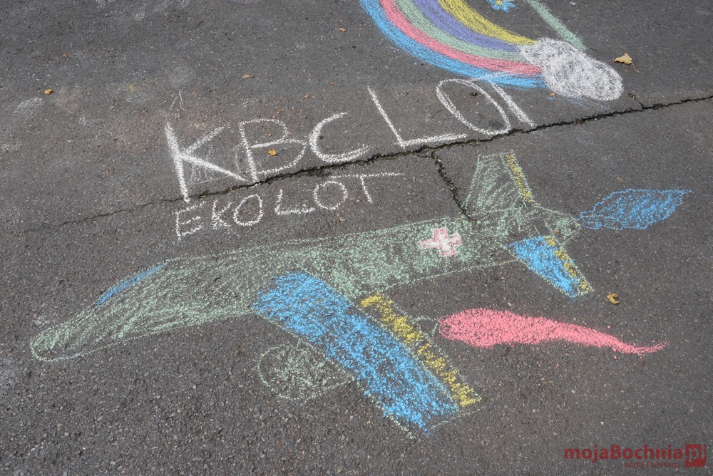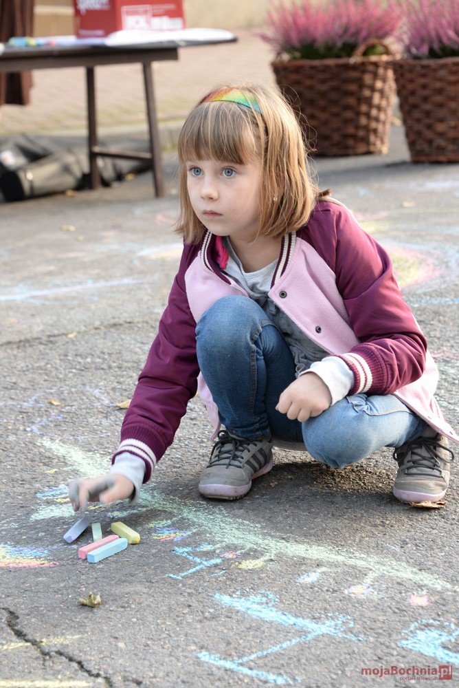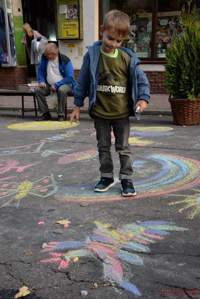 „Uliczne obrazy kredą malowane” – taki był tytuł zajęć, w trakcie których dzieci i dorośli mogli na zamkniętym dla ruchu kołowego Placu tworzyć swoje uliczne dzieła. Dla tych, którzy uważali że nie mają talentu plastycznego istniała możliwość odpoczynku na leżakach. W zabawie wzięło udział kilkadziesiąt osób, pozostawiając na drodze kolorowe obrazy przedstawiające m.in. ekologiczne środki transportu, wariacje na temat herbu Bochni, a także roślinność.
