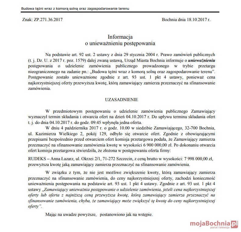 Postępowanie zostało unieważnione zgodnie z art. 93 ust. 1 pkt 4 ustawy, ponieważ cena najkorzystniejszej oferty przewyższa kwotę, którą zamawiający zamierza przeznaczyć na sfinansowanie zamówienia – podano w Biuletynie Informacji Publicznej.