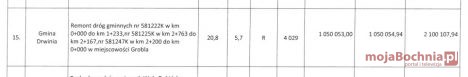 Spośród gmin powiatu bocheńskiego, najwyżej znalazł się wniosek Gminy Drwinia (pozycja 15, wnioski złożyło 46 gmin)), opiewający na 2,1 mln zł: