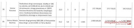 Wnioski Gminy Rzezawa i Gminy Miasta Bochnia znalazły się odpowiednio na miejscach 38 (545 tys. zł) i 39 (6,2 mln zł). Projekt złożony przez samorząd miejski obejmuje remont ulicy Partyzantów: