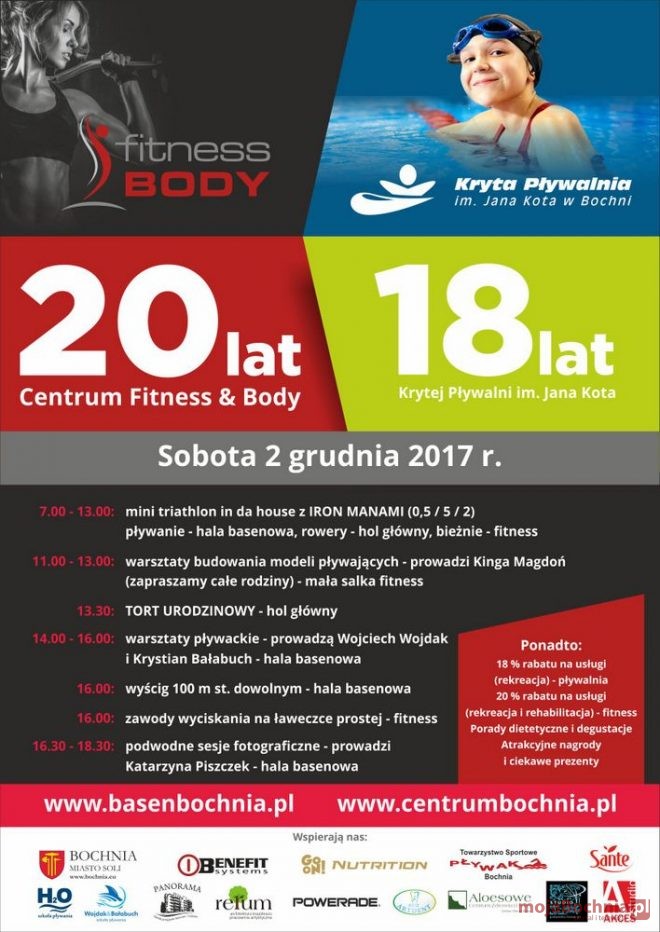 Już we wrześniu br. pojawiła się propozycja organizacji imprezy urodzinowej, a ponieważ sąsiadujące z nami Centrum Rehabilitacyjno-Rekreacyjne Fitness & Body jest od nas o pełne 2 lata starsze, dlatego wspólnie zapraszamy Państwa na połączone urodziny “20 lat Centrum Fitness & Body oraz 18 lat Krytej Pływalni w Bochni” – dodaje.